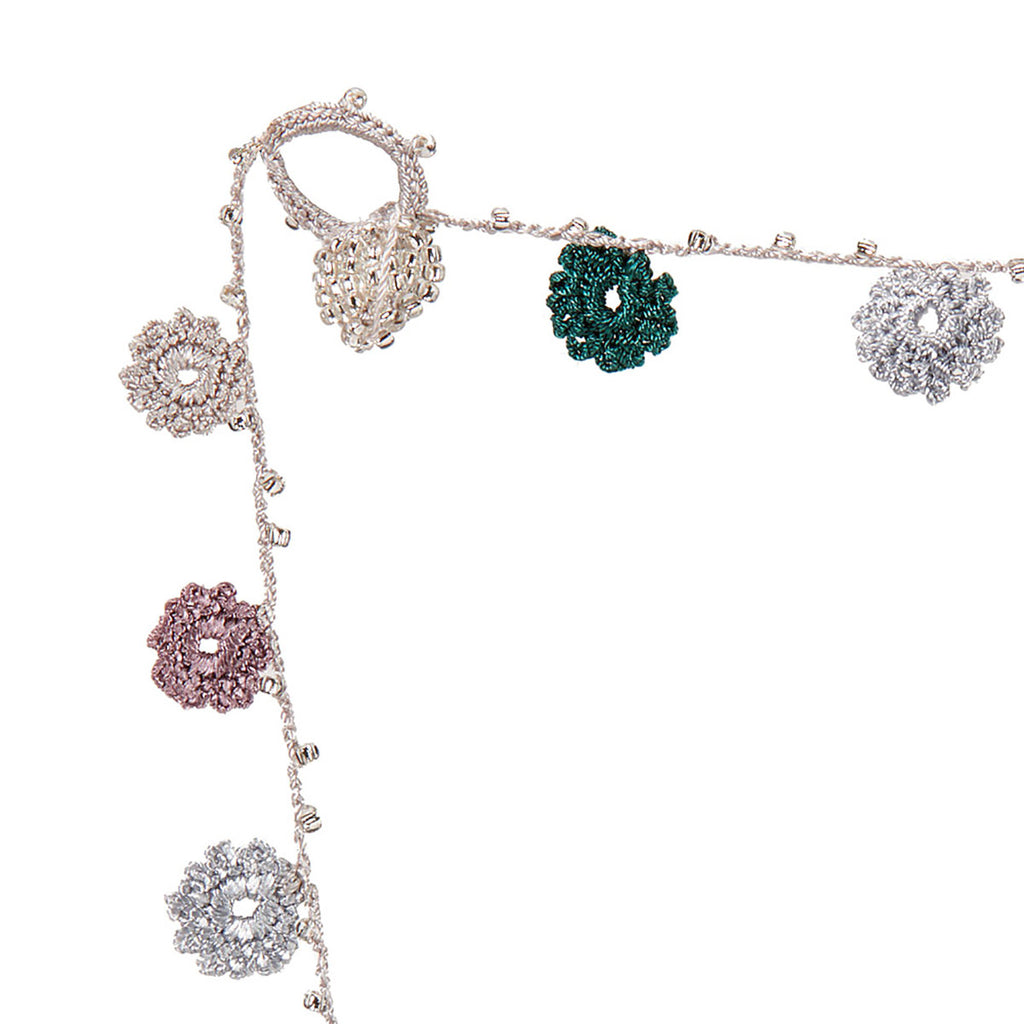 SHORT LENGTH: sits around the neck and the décolletage. It also works as a bracelet that turns around the wrist three times, depending on the size of the wrist. It has a clasp made with the same color beads as the ones incorporated in the necklaces between the crocheted flowers. It is in the shape of a ball and it is a typical design of the Turkmen tribes of Central Asia, which is quite remarkable because these balls or wheels normally sell individually and are quite expensive. In this case they are made by the same lady who produces the necklaces.