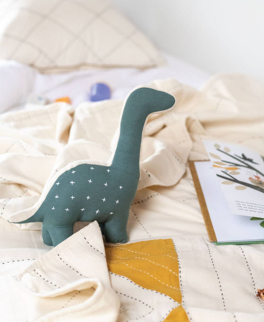This adorable and eco-friendly stuffed dinosaur features kantha-stitched details and is hand-made from upcycled scrap fabric pieces. Pair it with a small quilt as a perfect gift for an expecting family or keep it for yourself and display it on your favorite bookshelf.