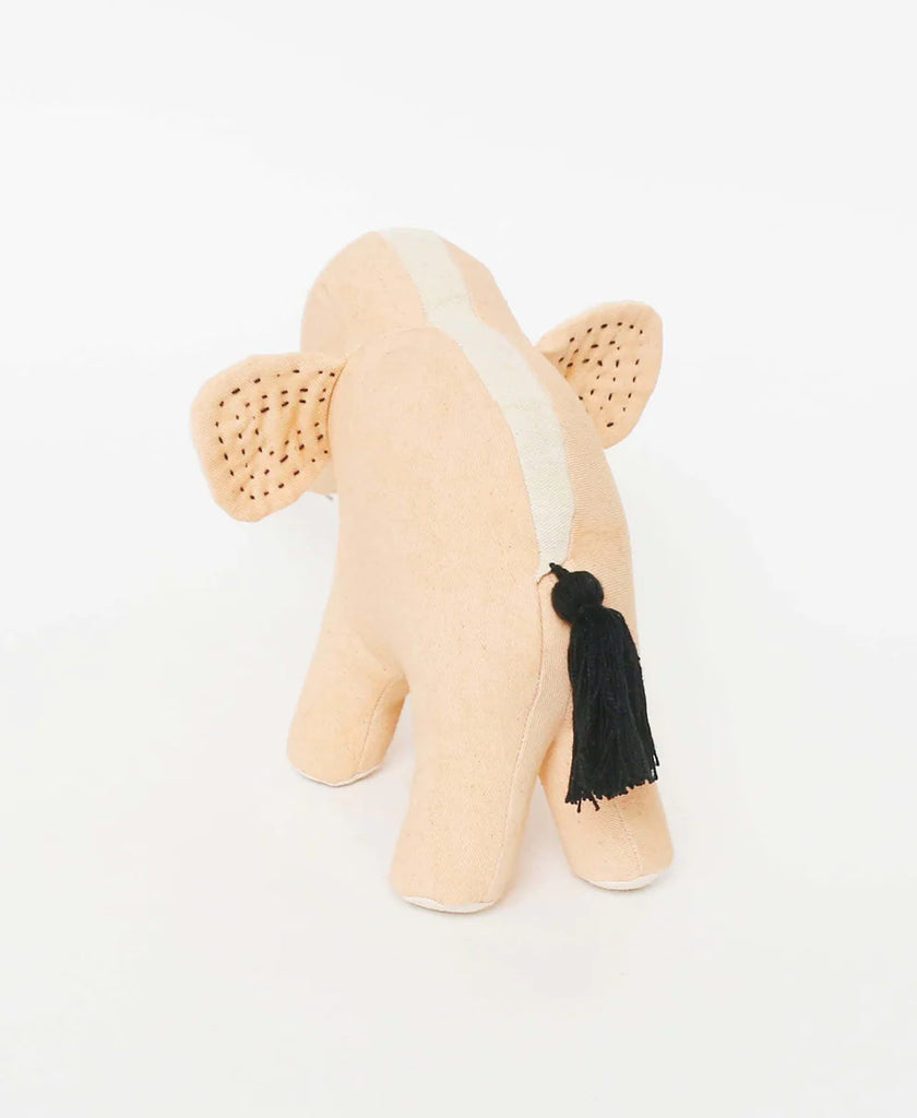 This adorable and eco-friendly stuffed elephant features kantha-stitched ears, a tassel tail and is hand made from scrap fabric pieces. Elephants symbolize good luck and unity in Indian culture. Pair it with a small quilt as a perfect gift for an expecting family or keep it for yourself and display on your favorite bookshelf.
