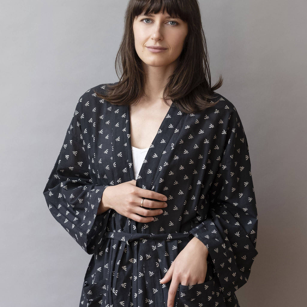 Hand-Blocked Printed Cotton Robe - Kako Black